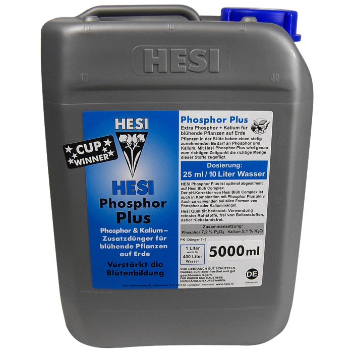 Pflanzen in der Blütephase haben einen stetig wachsenden Bedarf an Phosphor und Kalium. Mit HESI Phosphor Plus wird genau zum richtigen Zeitpunkt die richtige Menge dieser Stoffe zugefügt.